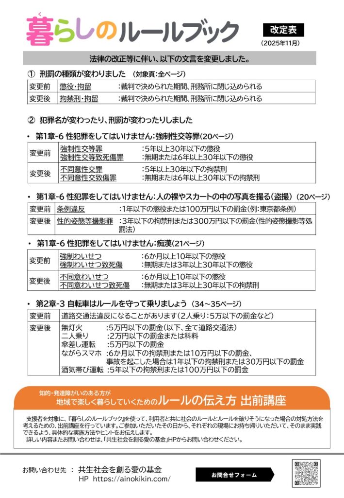 『暮らしのルールブック』改訂しました 2025年12月7日 最終更新日時 : 2025年12月7日 admin-ainokikin 『暮らしのルールブック』を発行して8年、法改正がいくつかありましたので、内容を改訂しました。これまでお買い上げいただきました皆さまには、こちらからご確認いただきますよう、よろしくお願いいたします。 ※PDFはこちらです。
